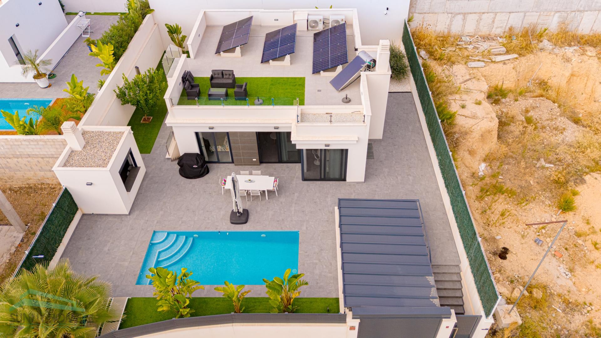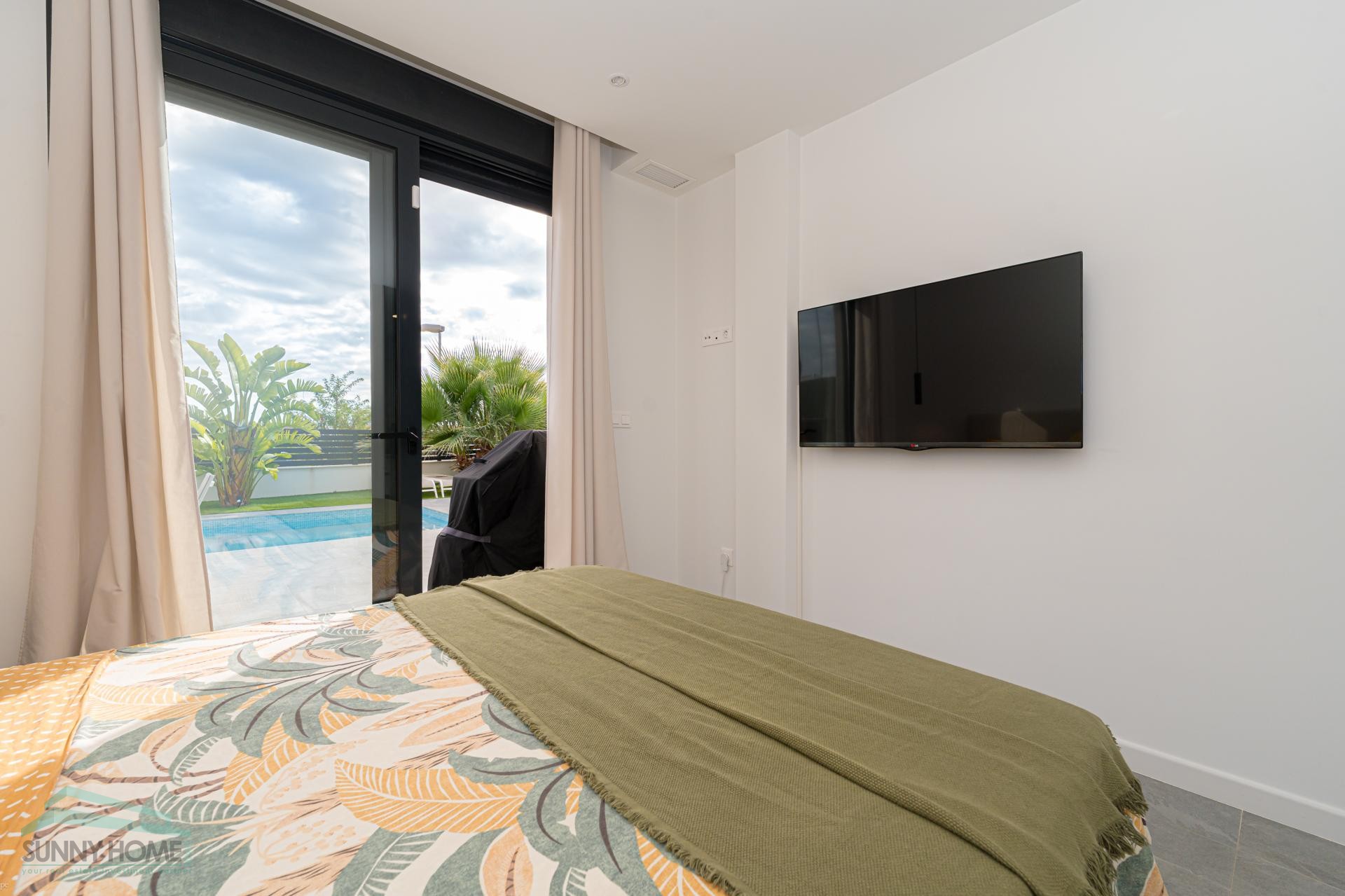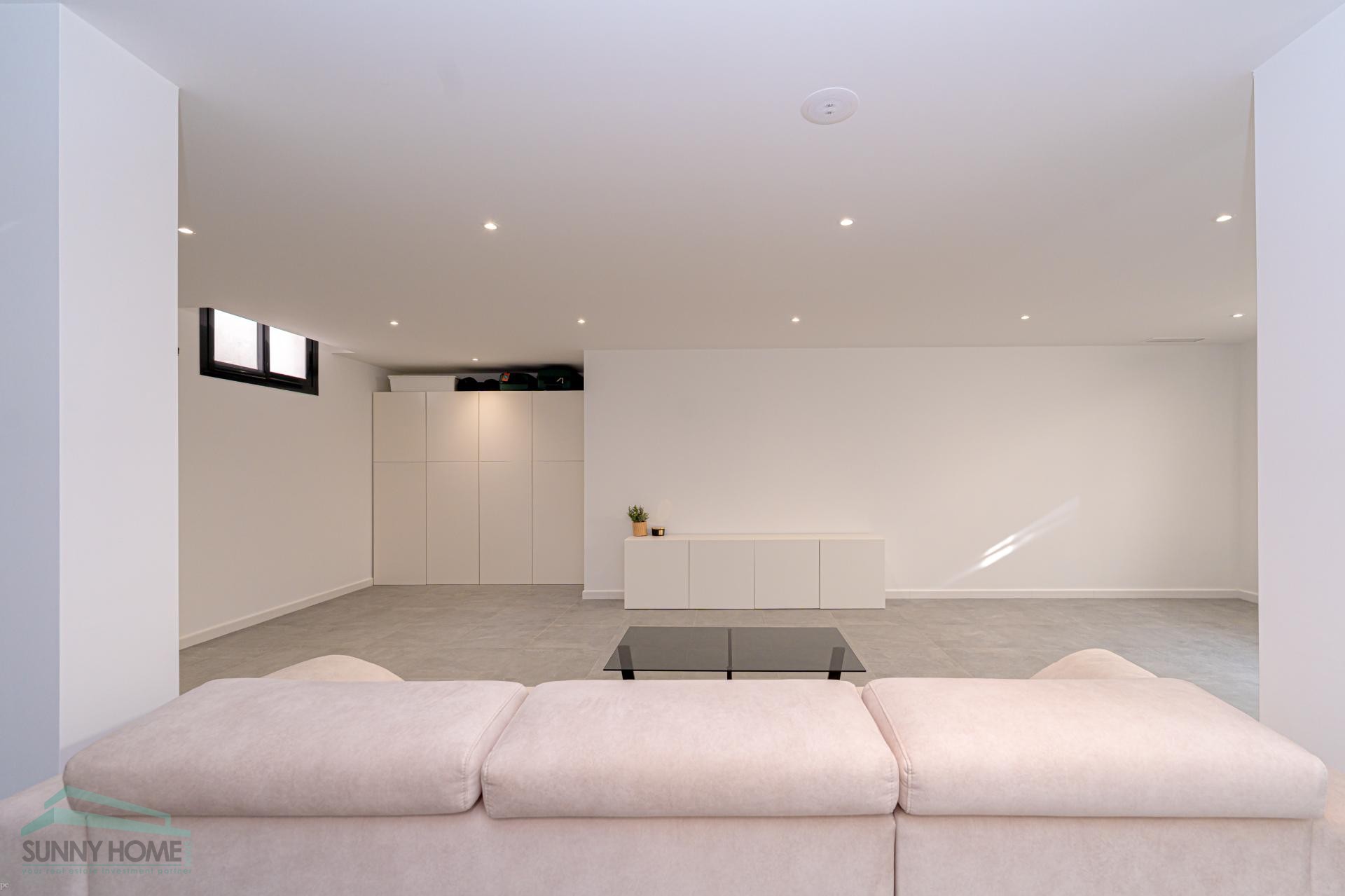Binnen geniet u van een lichte woon- en eetkamer met open, volledig uitgeruste Amerikaanse keuken, vijf slaapkamers en drie badkamers. Dankzij de grote raampartijen baadt de villa in natuurlijk licht en heeft u een vrij uitzicht op de omgeving.